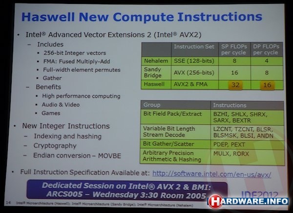 AVX2 is een uitbreiding op de nieuwe AVX-instructieset zoals die bij Sandy Bridge werd geïntroduceerd. Om het geheugen even op te frissen: het belangrijkste onderdeel van AVX was dat Intel de floating point rekeneenheden van de processor had opgewaardeerd om te kunnen werken met 256-bit getallen. Daarnaast bevatte AVX een twaalftal nieuwe instructies, waarvan een aantal geschikt voor drie variabelen, waarvan een instructie om C = A + B te doen het belangrijkste voorbeeld is. Om hetzelfde te bewerkstelligen moeten processors voor het AVX-tijdperk wegen een maximum van twee variabelen minimaal twee instructies uitvoeren: eerst A = A + B en daarna C = A.