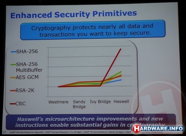 Naast de AVX2 extensies heeft Intel ook nog een aantal nieuwe instructies aan Haswell toegevoegd die encryptie-algoritmes kunnen versnellen. Veelgebruikte algoritmes als SHA-256, RSA en AES profiteren daarvan. De grootste prestatiewinst is te verwachten bij het berekenen van CRC-data; wanneer software van de nieuwe instructies gebruik maakt, zou dat tot meer dan 4x sneller kunnen gaan dan op een Ivy Bridge CPU. Nu steeds meer data op internet versleuteld wordt - denk aan VPN-verbindingen, gecodeerde video-conferencing streams, HTTPS-websites, etc. etc. - vormen deze nieuwe instructies voor flink snelheidsverbeteringen.