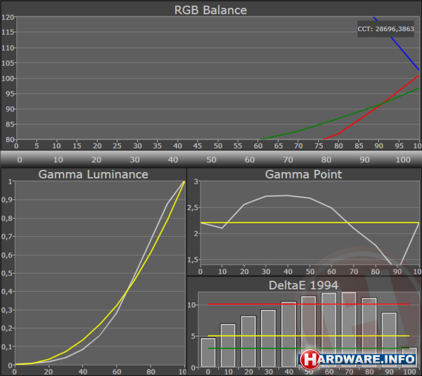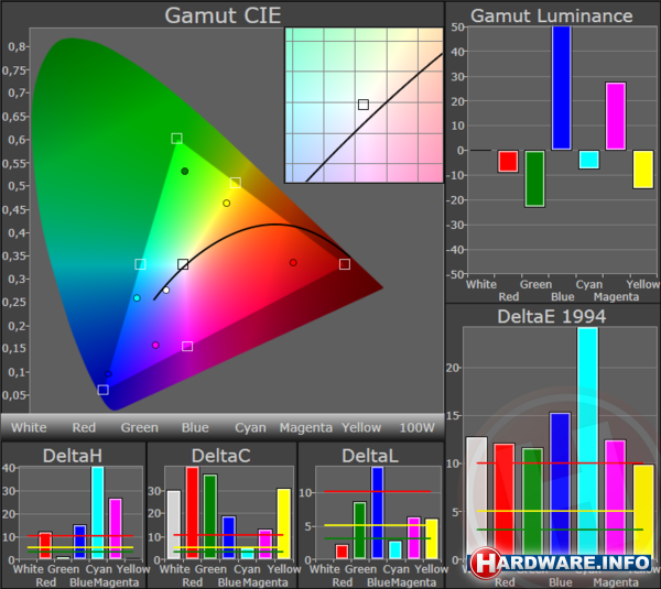 Het kleurbereik is ook niet al te groot. Daardoor zijn de kleuren minder gesatureerd dan het geval hoort te zijn. Cyaan en magenta hebben een duidelijk afwijking richting blauw. De onderlinge helderheid van de kleuren is veel meer uit balans dan zelfs voor een TN-paneel gebruikelijk is. Zo zijn blauw en magenta te helder en de overige kleuren te donker. De hier besproken afwijkingen zien we ook terug in de DeltaE 94 scores van de onderlinge kleuren. Allemaal scoren ze niet goed om en nabij de 10 punten (lager is beter).