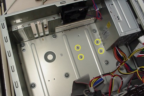 De bevestiging van de koeler is bij het Intel-bord een verhaal apart. Zoals wellicht bekend is er voor de Pentium 4 een vaste plaats op het moederbord bedacht, waar de processor zich altijd dient te bevinden. Op ASUS na hebben de andere fabrikanten zich daar ook braaf aan gehouden. Het idee hierachter is dat de bevestigingsmodule voor koeler dan door het moederbord heen op de kast vastgeschroefd kan worden. Een vereiste voor dit systeem is dat in de kast op de juist plaatsen afstandsbusjes kunnen worden geplaatst. Onderstaande foto laat dat zien: