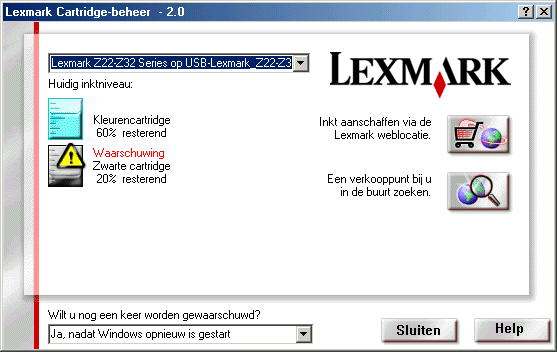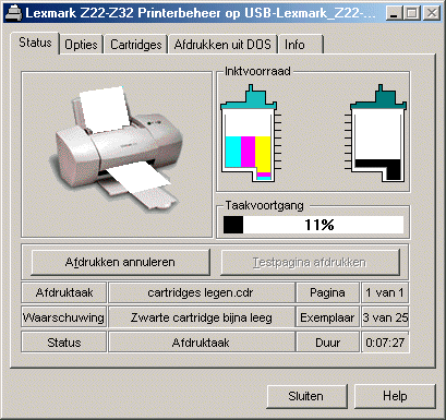 Verder gebruikt de driver een status-programma (dit schijnt blijkbaar te moeten tegenwoordig�) dat de status van de printer en de inktvoorraad in de gaten houdt. Het grappige is dat dit programma praat: zodra er een print gestart wordt, vertelt een vriendelijke vrouwenstem (die klinkt als Meta de Vries) je dat de print gestart is. Idem dito bij het voltooien of afbreken van een print. Ook waarschuwt dit programma vocaal als de inkt bijna op is. Gelukkig is deze �vocale ondersteuning� uit te schakelen vooraleer ze echt gaat vervelen.