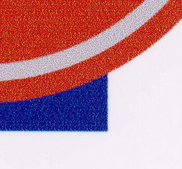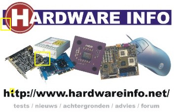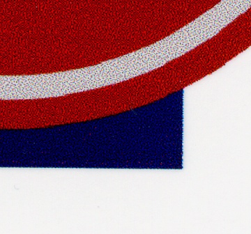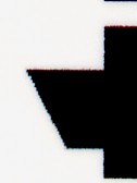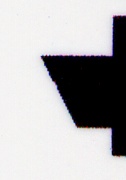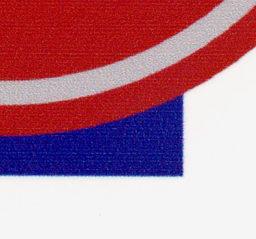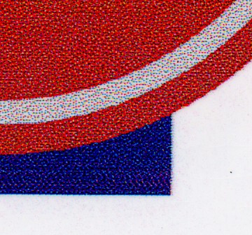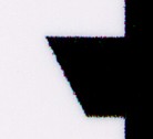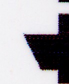De eerste scan is een uitvergroting van de hoek van het HardwareInfo.net-logo. Het betreft een stuk rechte lijn, een stuk cirkel, en een directe overgang tussen wit, rood en blauw. Hier kan men goed zien hoe de printer zich redt met lijnen, cirkels en aan elkaar grenzende kleuren.