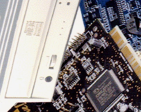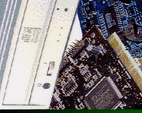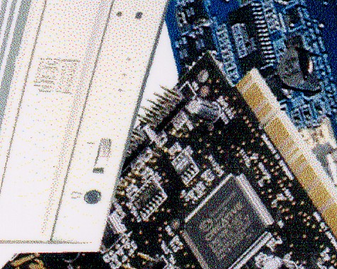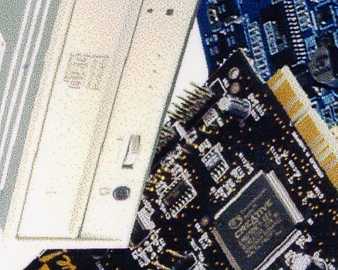 Op de tweede scan overlappen drie onderdelen elkaar, te weten een zwarte Creative geluidskaart, een Hercules videokaart en een witte CD-speler. De geluidskaart is goed om te zien hoe de printer details afdrukt, de videokaart bestaat uit een lastige kleur blauw, en de CD-speler verraadt meteen het optreden van korrelvorming.