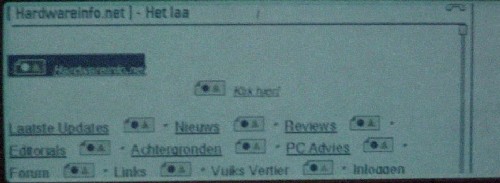 Wie onder de optie ‘internet’, internet via WAP had verwacht heeft het helemaal mis. De Nokia 9110 is uitgerust met een browser die normale internetpagina’s op het schermpje kan toveren. U begrijpt dat de kwaliteit niet is wat we van een gemiddelde internetbrowser gewend zijn. Doordat er veel meer internetpagina’s zijn dan WAP-pagina’s is het fijner om een volledige browser te hebben als er snel iets moet worden opgezocht. Hierbij moet wel worden vermeld dat de site die bezocht wordt eenvoudig van opzet is, want anders duurt het niet alleen lang voordat de informatie op het scherm staat, maar is het ook nog eens onhandig surfen. Onze eigen pagina ziet er zo uit: