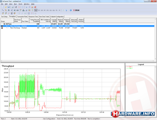 Om een beeld te krijgen van de prestaties van de powerline-adapters in meerdere situaties, hebben we zoals gezegd een geïsoleerd netwerk gemaakt met overgangen van goede kwaliteit en met vaste afstanden van 25 en 50 meter. Die laatste afstand verlengen we ten slotte met een stekkerdoos van vrij matige kwaliteit om storing te veroorzaken. Zoals je kunt zien in op de pagina's met de testresultaten, zijn de gevolgen hiervan duidelijk zichtbaar. De metingen zijn gedaan met behulp van Ixia IxChariot, een van de toonaangevende programma’s op de markt om doorvoersnelheden binnen netwerken te meten.