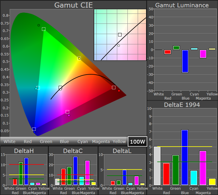 Het grijsverloop ziet er goed uit met de drie basiskleuren dicht op de plek waar ze horen te zijn. Ook het gamma is met gemiddeld 2,19 uitzonderlijk goed. Na kalibratie zijn deze waardes hoogstwaarschijnlijk helemaal perfect te krijgen.