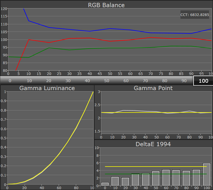 De kleurtemperatuur is met 6953 Kelvin net iets blauwer dan de ideale waarde van 6500. De helderheid van 296 cd/m² is goed en samen met de helderheid van zwart van 0,295 cd/m² is het contrast ook prima met 1003:1.
