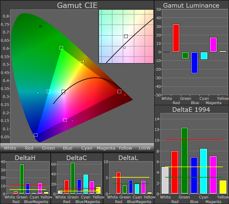 Als we de Calman testsoftware doen denken dat de monitor sRGB weergeeft is duidelijk te zien hoe veel verder de kleuren reiken. In het voorbeeld is dit goed te zien. Hierdoor zijn de DeltaE 94 scores ook niet al te best. Als we meten in AdobeRGB komen er betere scores naar voren en is het verbazingwekkend dat de kleuren zelfs verder reiken. Dit betekent dat er nog een kleine afwijking is, maar na kalibratie zijn alle kleuren terug te brengen naar de juiste plek in het AdobeRGB gebied. Zonder kalibratie hebben de meeste kleuren al een goede prestatie onder de acceptabele grens van 5 DeltaE 94 punten. Alleen blauw loopt te ver uit. Ook bij de onderlinge helderheid is blauw net iets te donker.