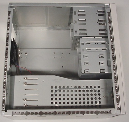 Het assembleren van ons testsysteem in de behuizing ging vrij gemakkelijk. Het openen van de behuizing gaat kinderlijk eenvoudig door slechts één schroef los te draaien. Hierdoor kan de bovenkant van de kast worden verwijderd waarna twee handvaten zichtbaar worden. Door deze handvaten op te tillen en eraan te trekken worden de beide zijkanten van kast weggenomen. Alleen het verwijderen van de metaalstukje in het I/O-plaatje (het plaatje waar onder andere de keyboard, muis en USB poorten naar buiten komen) geeft problemen. Deze stukjes metaal zitten zo goed vast dat er heel wat kracht moet worden gezet met het nodige gereedschap.