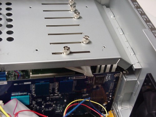 Het inbouwen van de rest van de onderdelen vormt gelukkig geen enkel probleem. Er kunnen vijf 3½ inch drives worden ingebouwd en drie 5¼ inch. Deze laatste dienen te worden voorzien van een plastic plaatje waarna de drives als een slee in de PC kunnen worden geschoven. Voordat het moederbord in de kast kan worden geplaatst dient eerst een plaat met klemmen te worden verwijderd. Deze plaat zorgt ervoor dat alle insteekkaarten niet naar achter kunnen schuiven. In veel 19 inch server-kasten komen we deze extra beveiliging ook tegen omdat het niet gewenst is dat insteekkaart tijdens het functioneren van de PC of server uit het moederbord schuift.