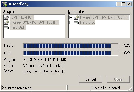Het eerst wat we gedaan hebben is een DVD-ROM, die meer dan 4 GB aan data bevat, getracht te kopiëren op een DVD-R. Het programma InstantCopy leent zich hier uitermate goed voor. We kozen ervoor om de bron-DVD eerst helemaal te laten inlezen en daarna pas te laten schrijven. Na een goed verlopen simulatie was het tijd voor het echte werk. Zonder enige foutmelding werd het schrijven van de DVD-R tot een goed einde gebracht.