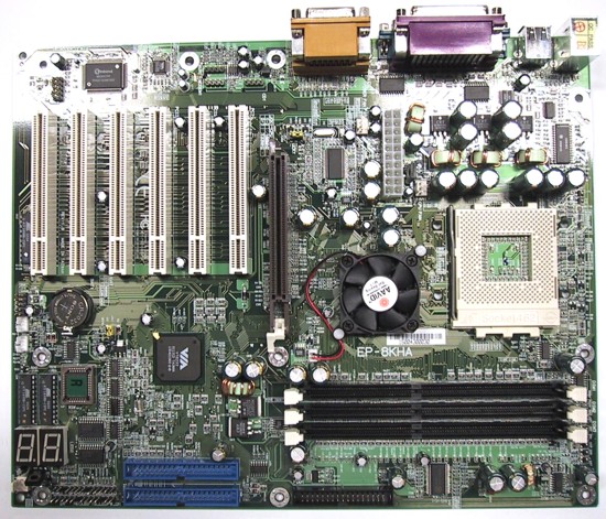 Ook bij Epox lijken de AMD 760 en VIA KT266 moederborden vrij veel op elkaar, wat in dit geval natuurlijk niet erg is. Onderstaande foto toont de EP-8KHA met de VIA KT266 chipset.