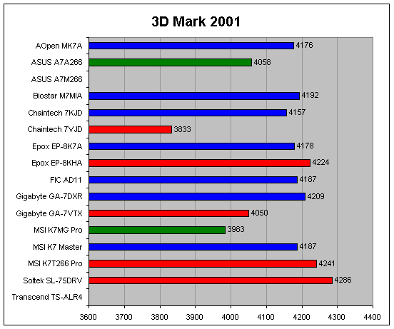 Onderstaande grafiek toont de resultaten van de 3D Mark 2001 benchmarks. Voor de duidelijkheid zijn moederborden met AMD 760 chipset aangegeven met blauwe balken, moederborden met VIA KT266 chipset met rode balken en moederborden met ALi MaGiK1 chipset met groene balken. Om de verschillen duidelijker naar voren te laten komen, hebben we onderstaande grafiek laten beginnen met 3700 en niet bij 0. Let daar op!