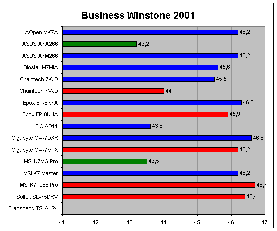Onderstaande grafiek toont de prestaties van de verschillende moederborden in de Business Winstone 2001 test. Ook deze grafiek hebben we niet bij 0 laten beginnen om de verschillen te verduidelijken. Let daar dus op bij het interpreteren van de grafiek.