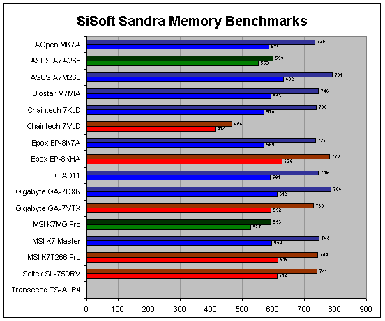 De resultaten in bovenstaande grafiek zijn uiteraard weinig tekenend voor de uiteindelijke 'real life' performance van de moederborden. De waardes kunnen wel tekenend zijn voor applicaties die zeer geheugen intensief zijn. Wederom presteren de AMD 760 en VIA KT266 vrijwel gelijk. Achterblijvers zijn zoals eerder ook al de moederborden met ALi chipset, die duidelijk een lagere geheugen bandbreedte hebben, en wederom het Chaintech CT-7VJD moederbord.