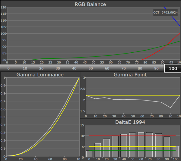 In het grijsverloop zitten de drie basiskleuren niet op de juiste plek. Groen en rood zijn te donker en blauw te licht. De gammameting toont ook afwijkende waardes met een daling richting 90 procent. Hierdoor is op dat punt het scherm te licht. Het gemiddelde gamma van 1,97 komt dan ook niet in de buurt van het gewenste 2,2.