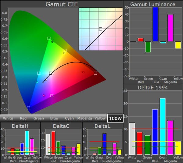 Het kleurbereik is kleiner dan het sRGB kleurgebied en de verhoudingen tussen de kleuren toont grote afwijkingen. De onderlinge helderheid van de kleuren is niet goed met grote uitschieters van blauw en magenta. Geen van de kleuren presteren goed in de DeltaE 94 puntentelling. Alles komt slecht uit boven de acceptabele grens van vijf. Een lager getal is beter bij deze puntentelling.