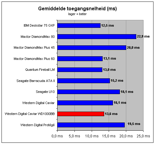 Voor personen die van veel kleine bestandjes gebruik maken of bijvoorbeeld voor database (web-)servers is de gemiddelde toegangstijd van de harddisks veel belangrijker. Dit is de tijd die gemiddeld verstrijkt tussen het aanvragen van een stuk data en het beginnen van de datatransmissie. Ook deze gemiddelde toegangstijd hebben we met behulp van Winbench gemeten.