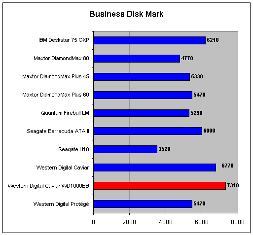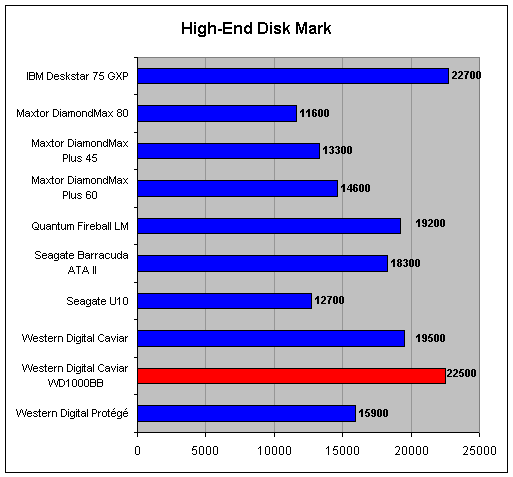 Hier moet het product van WD genoegen nemen met een respectabele tweede plaats op het erepodium. De eerste plaats wordt hier ingenomen door de IBM Deskstar 75 GXP. Al met al mag Western Digital zonder meer trots zijn op de prestaties van de nieuwe 100 GB harddisk.