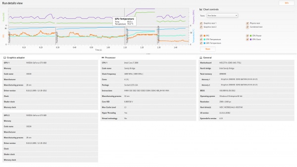 Wie zelf met de nieuwe 3DMark aan de slag gaat, zal zien dat de benchmark een interessant nieuw resultatenscherm heeft. Naast een hoofdscore en deelscore toont de benchmark nu ook een grafiek met daarin over de gehele looptijd van de test de framerate, CPU-temperatuur, GPU-temperatuur, CPU-klokfrequentie en CPU-stroomverbruik. Ideaal voor overklokkers die exact in de gaten willen houden hoe het systeem gedurende de benchmark heeft gepresteerd.