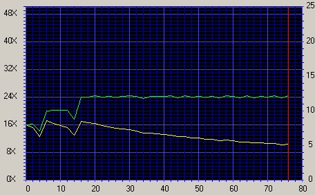 Met behulp van de techniek Zone-CLV wordt de opgegeven maximale snelheid eenvoudig behaald. Wel blijft de brander een beetje schommelen rond de 24X speed. Dit hoeft echter geen enkel probleem te zijn voor het branden van een CD. Immers loopt de buffer (2 MB) er niet direct door leeg, waardoor een ‘gap’ of ‘link’ (kleine fout die gemaakt wordt bij het hervatten van het brandproces) ontstaat omdat BURN-proof moet ingrijpen.