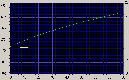 De CD-writer CD24p kan goed overweg met het lezen van zowel data- als audio-cd’s. Bij beide wordt een uiteindelijke snelheid van iets meer dan 40X speed behaald. We hebben de brander ook een aantal gebrande CDR’s laten lezen. Zoals in de onderstaande figuur te zien is, heeft de brander daar absoluut geen problemen mee (iets wat we helaas niet van alle modellen branders kunnen zeggen!).