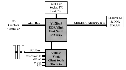 Onderstaand blokschema laat de opbouw nog eens zien. De bus tussen de north-bridge (VT8633) en de south-bridge (VT8233) is dus de nieuwe V-Link bus.