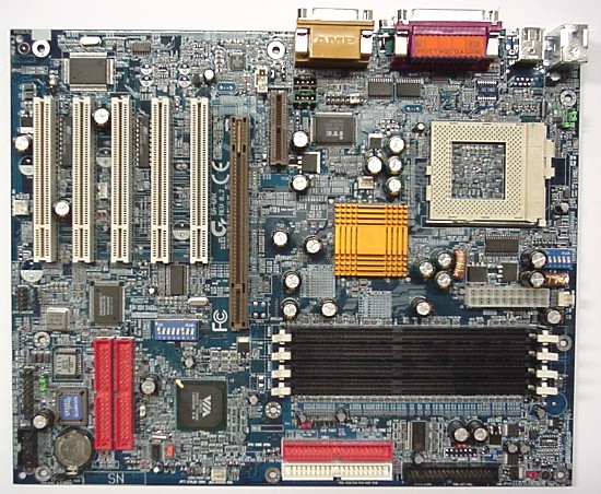 Opvallend is dat Gigabyte als enige vier DIMM-sloten op het moederbord heeft verwerkt, wat ik zondermeer een pluspunt vind. Ook heeft Gigabyte in plaats van een normaal AGP-slot een AGP-Pro slot op het bord gesoldeerd, al betwijfel ik of er ook maar iemand een bord als dit gaat combineren met een zeldzame en professionele AGP-Pro videokaart. Verder vinden we op het bord vijf PCI-sloten en een CNR-slot.