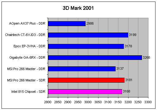 Let op: deze grafiek begint niet bij 0, maar bij 2800. Zoals te zien biedt de VIA Apollo Pro 266 chipset met DDR-geheugen gemiddeld net wat meer prestaties bij 3D-games als de bekende Intel 815 chipset. De verschillen zijn echter uiterst miniem. Positieve uitschieter is het Gigabyte moederbord, dat een veel hogere score weet neer te zetten dan de andere moederbord. Negatieve uitschieter is zoals eerder al gezegd het AOpen moederbord, dat hier niet eens in de buurt van de prestaties van de andere moederborden kan komen. Frappant is en blijft dat het MSI moederbord met SDR-geheugen beter presteert dan met DDR-geheugen.