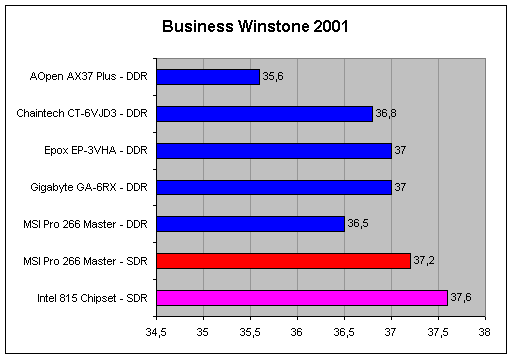 Zoals bekend is Business Winstone 2001 een goede maatstaf voor de prestaties van een PC-systeem bij Office-applicaties zoals Word en Excel. Onderstaande grafiek toont de scores van deze benchmark bij de verschillende moederborden.