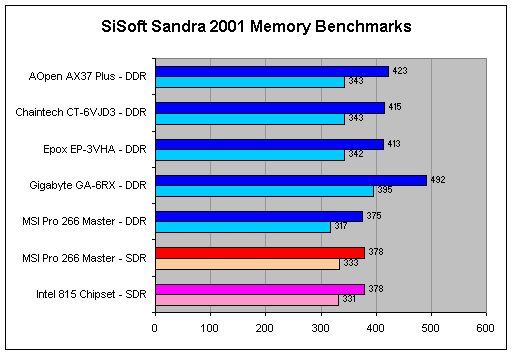 Want hoewel DDR-geheugen in theorie twee maal zo snel kan zijn als SDR-geheugen, zien we daarvan dankzij de langzame Pentium III front side bus maar bar weinig terug. De scores van de DDR-moederborden zijn maar een kleine fractie hoger als die van de Intel 815 chipset met SDR-geheugen. Al met al is de VIA Apollo Pro 266 chipset dus niet echt iets waar we intens gelukkig van worden.