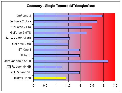 De Geometrie test kijkt naar het aantal 25-pixel triangels die een kaart per seconde kan genereren. De score van de G550 is ook hier niet geweldig.