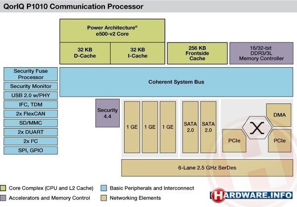 We hebben niet fysiek kunnen checken welke CPU er op het bordje zit, maar het zou gaan om een Freescale P1010. Hieronder zie je een blokdiagram van deze chip. Het valt overigens op dat deze volgens de specificaties ondersteuning biedt aan een enkele USB-aansluiting, dus TP-Link heeft een handigheidje uit moeten halen om de tweede ook aangestuurd te krijgen.