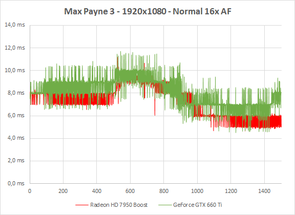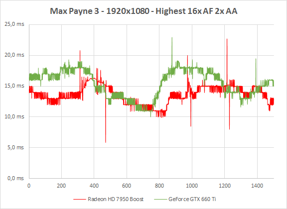 Bij Highest settings is AMD opnieuw net wat sneller: 72,3 ten opzichte van 63,5 fps. Wederom zijn de frame rendertijden op een zeer enkele uitzondering na erg consistent, waardoor ook de 99e percentielwaardes erg dicht bij elkaar liggen. Max Payne 3 in Full HD met maximale settings draait zowel op een GTX 660 Ti als een Radeon HD 7950 prima.