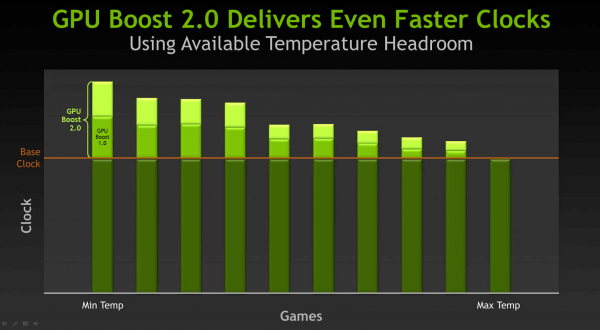 Waar GPU Boost 1.0 bij de GTX 680 en andere 600-serie kaarten enkel rekening houdt met het stroomverbruik, is GPU Boost 2.0 bij de Titan temperatuurgestuurd. De kaart stuurt aan op een grens van 80 graden Celsius. Is de GPU koeler, dan wordt de klokfrequentie verhoogd en zullen de prestaties stijgen. Ofwel: hoe lager de temperatuur, hoe verder de kaart zich zal laten overklokken. Dat betekent ook dat betere koeling (zoals waterkoeling) zal resulteren in betere prestaties. De controle op stroomverbruik blijft overigens secundair in takt: standaard zorgt de kaart ervoor dat het totale verbruik van de kaart nooit de 250 watt voorbijgaat.