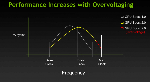 Een ander onderdeel van GPU Boost 2.0 is de mogelijkheid om het voltage van de GPU te verhogen, zonder speciale modificaties uit te voeren. Het overvolten kan overigens alleen wanneer het merk waarvan je een Titan-kaart koopt het goed vindt en na het accepteren van een waarschuwing over mogelijk verminderde levensduur van je kaart. Door het voltage te verhogen zijn potentieel nog hogere klokfrequenties en dus prestaties mogelijk.