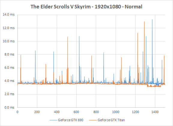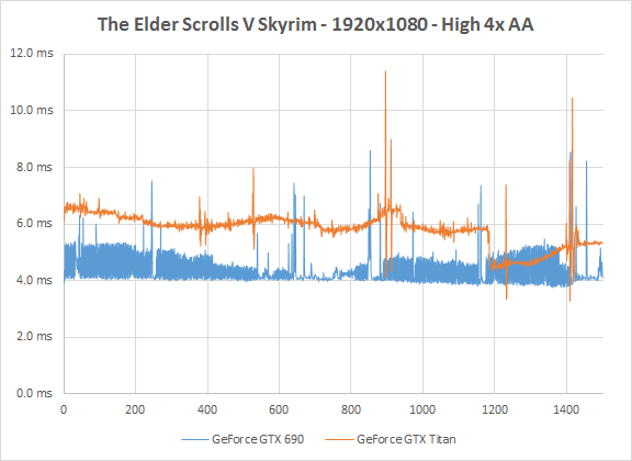 Skyrim in Full HD is weer een typisch voorbeeld van een game waar je eigenlijk geen high-end videokaart voor nodig hebt. Ook een GeForce GTX 660 blijkt snel genoeg voor Skyrim op Full HD met hoogste settings. In die hoogste instelling blijkt de GTX 690 gemiddeld wat sneller, maar wel met een hogere variatie in rendertijden, waardoor in de praktijk het verschil tussen de GTX 690 en de GTX Titan beperkt is.