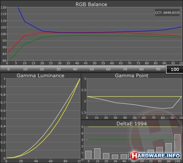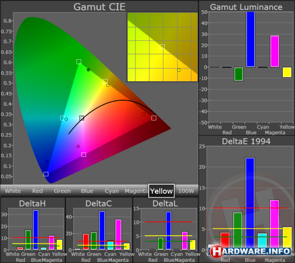 Het kleurbereik is in beide gevallen kleiner dan het sRGB kleurgebied. Alle kleuren zitten te ver naar binnen. De onderlinge helderheid van de kleuren is ook niet goed met grote uitschieters van blauw en magenta. Alleen rood en cyaan presteren netjes onder de acceptabele grens van 5 punten in de DeltaE 94 puntentelling. De overige kleuren zitten tot ver boven dat getal. Lager is in dit geval beter. Vijf is acceptabel en onder de drie een goede prestatie.
