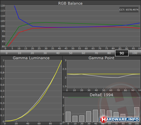 Voor het testen van het beeldscherm maken we gebruik van SpectraCal CalMAN in combinatie met een X-Rite i1 Display Pro colorimeter.