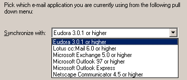 Met de meegeleverde software van PALM kunnen we WEL de mail met Outlook synchroniseren maar NIET de agenda, de contactpersonen, de taken en de notities. We kunnen met de standaard software mail vanuit een aantal programma's synchroniseren. Het onderstaande scherm toont dat we verschillende mogelijkheden hebben. Dit scherm komt tevoorschijn wanneer ik de Palm software installeer of wanneer ik later de geïnstalleerde software wil wijzigen.