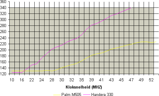 Vreemd is dat hoewel beide systemen een identieke processor zouden moeten hebben - namelijk een Motorola VZ Dragonball 33 MHz - vertonen ze verschillend gedrag. De score die de Handera 330 retourneert loopt langzaam op terwijl score van de M505 tot 28 Mhz vrij constant blijft en pas naar boven loopt. De uiteindelijke conclusie is dat de M505 langzamer is dan de Handera 330.
