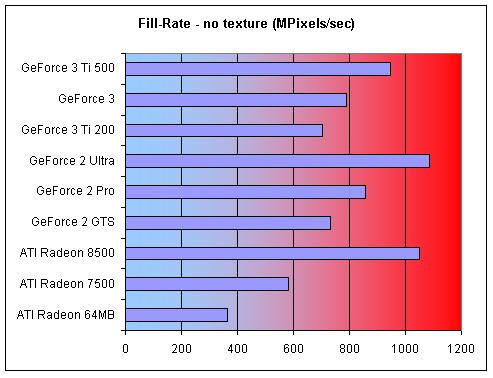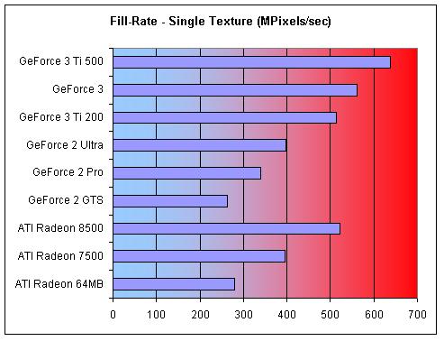 Wordt bij dezelfde test gebruikt gemaakt van texturing dan valt de Radeon 8500 gek genoeg bijna 50% terug, iets wat niet zou moeten gezien de opbouw van de chip. Zonder texturing komt de Radeon 8500 met gemak boven de GeForce 3 chipsets uit, met single texturing is het beeld omgekeerd.