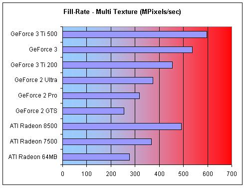 Multitexturing verandert weinig aan het plaatje, de Radeon 8500 kan echter nog steeds niet aan de prestaties van de GeForce 3 classic en Ti 500 tippen. Waarschijnlijk hebben we ook hier te maken met een probleem dat door betere drivers verholpen kan worden. De fill-rate van de Radeon is namelijk veel hoger dan die van de GeForce 3 chipsets.
