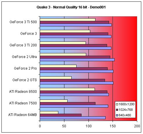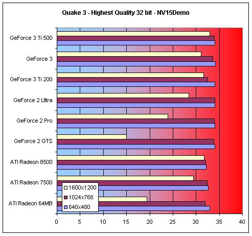 De NV15Demo voor Quake III is een echte T&L killer, maar ook de CPU krijgt er flink van langs. Hierdoor zit er weinig verschil tussen de 640x480 en 1204x768 scores, pas in 1600x1200 komt de grafische chipset tot volledige kracht. In die modus valt op dat de Radeon 8500 aardig mee kan met de GeForce 3 chipsets.