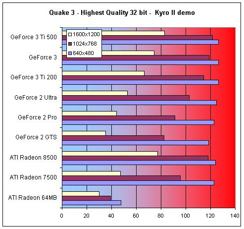 De Kyro demo maakt gebruik van veel overdraw en waar we eerder zagen dat de Radeon 8500 daar prima mee overweg kon, moet de kaart hier toch zijn meerdere erkennen in de GeForce 3 Ti 500, waarschijnlijk wederom een driver kwestie.