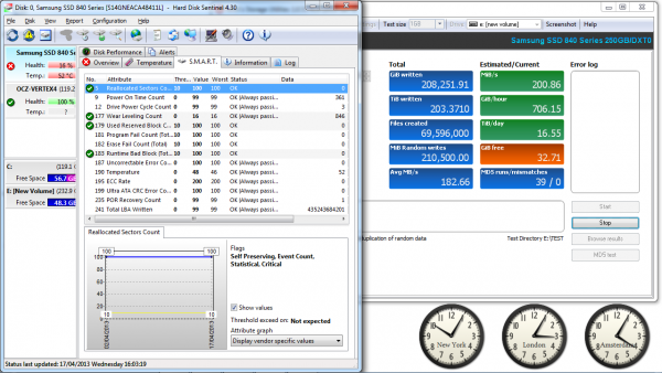 In de S.M.A.R.T. data kunnen we zien dat alle cellen inmiddels 846x beschreven zijn geweest (vandaar de wear level indicator op 16). Intern is er dus 256 GiB * 846 = 211,5 TiB geschreven, extern staat de teller op 203 TiB. Dat betekent een extreem lage WAF van 1,04, wat op zich wel te verklaren is, omdat onze test netjes sequentieel alle lege ruimte volschrijft, leegmaakt en opnieuw begint. Gemiddeld bij “normaal gebruik” zit de WAF op ongeveer 3. Dat zou betekenen dat de 211,5 TiB die we tot nu toe hebben geschreven overeen komt met circa 70 TiB aan writes bij normaal gebruik. Met het gemiddelde van 10 GB aan writes per dag voor normale gebruikers, betekent dit alsnog dat we inmiddels 7168 dagen ofwel 19,6 jaar aan normaal gebruik hebben gesimuleerd. Met een WAF van 1,03 hebben we dus bijna 60 jaar gebruik gesimuleerd. Inmiddels is dus wel bewezen dat je je over de betrouwbaarheid van de Samsung 840 SSD’s geen zorgen hoeft te maken.
