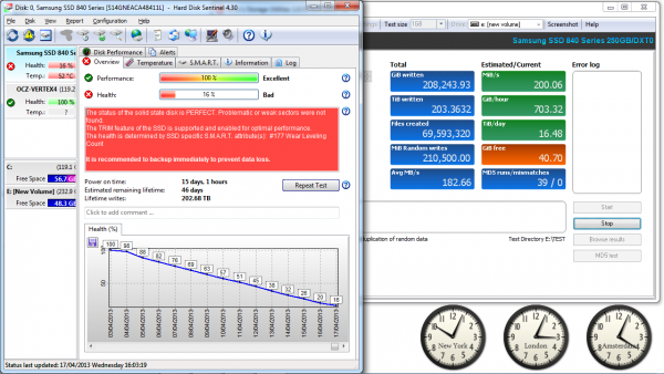 De testsystemen met de Samsung 840 SSD’s draaien inmiddels twee weken en een dag. Was de Wear Level indicator een week geleden gezakt naar 59, inmiddels zitten we op 16. Dat betekent dat we het grootste gedeelte van de officiële levensduur van de SSD gehad hebben. Ergens in de komende week zullen we op 0 uitkomen. Vanaf dat moment is natuurlijk de vraag hoe lang de SSD’s het buiten de officiële levensduur blijven doen.