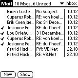 Wanneer we nu de applicatie gekozen hebben dan wordt bij de volgende HotSync de mail die in het "Postvak IN" staat naar de Palm gekopieerd. We kunnen dan de ontvangen mail lezen en hierop antwoorden. De nieuwe mail die we op de Palm hebben geschreven wordt dan bij de volgende synchronisatie met de PC via het mail programma verstuurd.