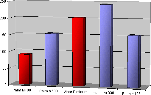 De M125 bevat net als de M500 en M505 een 33 MHz Motorola Dragonball VZ processor. De snelheid is met Benchmark 2.0 getest. Dit programma doet een Fibonacci berekening en baseert daar de snelheid op. We hebben de Handspring M125 vergeleken met andere PDA's waarvan we de Benchmark score hadden. We hebben de score gepakt die geretourneerd wordt wanneer we het programma laten lopen op de standaard snelheid van de PDA zonder dat Afterburner geactiveerd is. Zoals we zien is er een groot verschil tussen de verschillende PDA's. We zien echter ook dat de score van de M125 gelijk is aan die van de M500/M505.