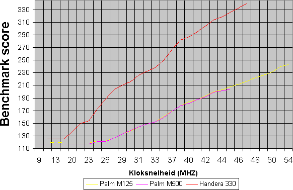 Alledrie de systemen hebben een identieke processor. Ze vertonen echter verschillend gedrag. De score die de Handera 330 retourneert loopt langzaam op, terwijl score van de M125 / M500 tot 28 Mhz vrij redelijk constant blijft en daarna pas naar boven loopt. De uiteindelijke conclusie is dat de M125 langzamer is dan de Handera 330. Wat we wel zien is dat de score van de M125 t.o.v. de M500/M505 vrijwel gelijk is. Palm is dus wel consequent qua processor prestaties.